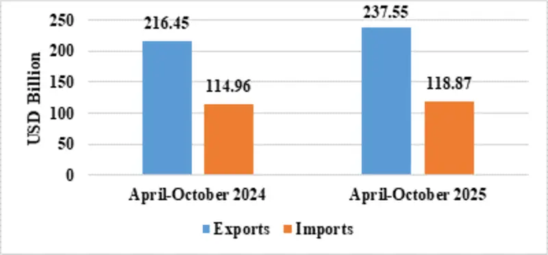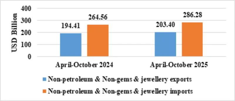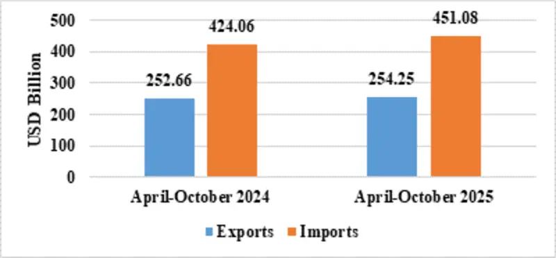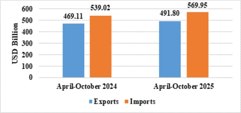 India’s total exports during April-October 2025* is estimated at US$ 491.80 Billion registering a positive growth of 4.84 percent. Total imports during April-October 2025* is estimated at US$ 569.95 Billion registering a growth of 5.74 percent.