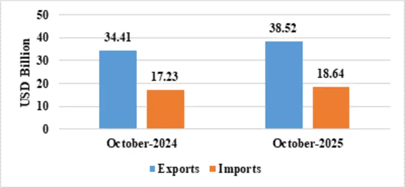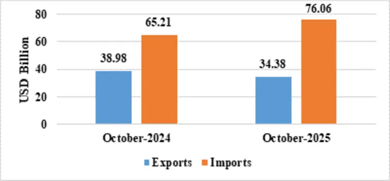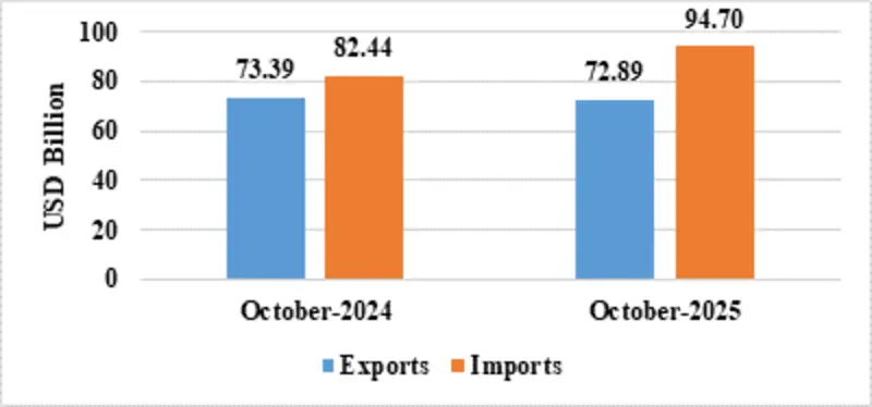 India’s total exports (Merchandise and Services combined) for October 2025* is estimated at US$ 72.89 Billion, registering a negative growth of (-) 0.68 percent vis-à-vis October 2024. Total imports (Merchandise and Services combined) for October 2025* is estimated at US$ 94.70 Billion, registering a positive growth of 14.87 percent vis-à-vis October 2024.