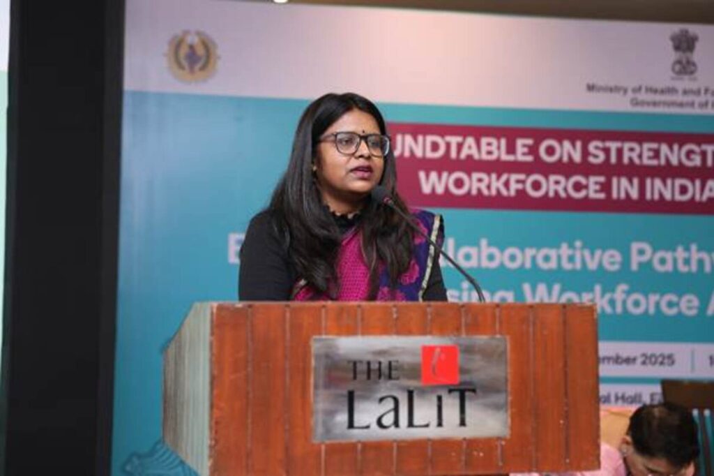 Delivering the keynote address, Ms. Akanksha Ranjan, Deputy Secretary (Nursing & Dental), Ministry of Health and Family Welfare, noted that the roundtable is taking place at an opportune moment, coming just after the three-day National Strategic Meeting that discussed the future direction of nursing policy in India. She reiterated that “nurses are the backbone of healthcare” and emphasized the need to build a more resilient and competency-based nursing workforce.
