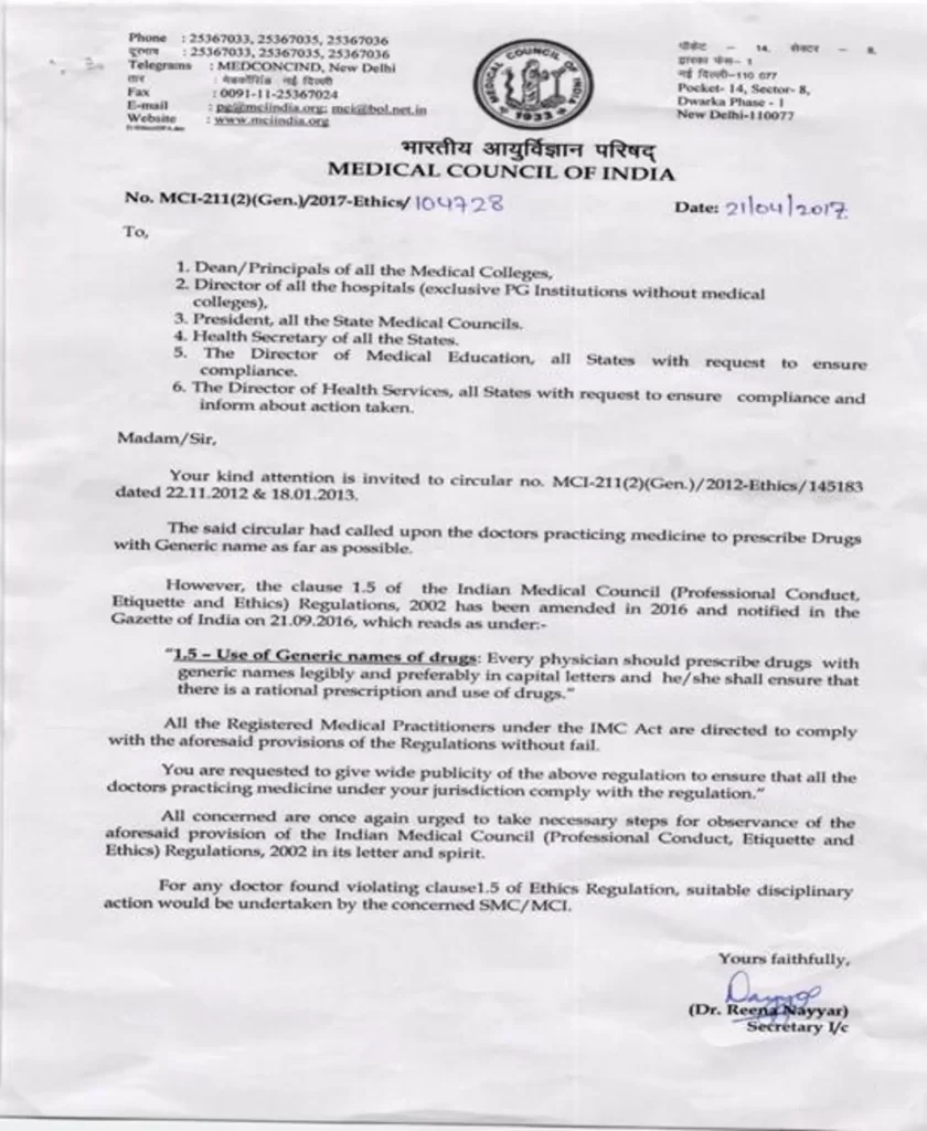 Paragraph 1.5 of the Code of Medical Ethics in the Indian Medical Council (Professional Conduct, Etiquette and Ethics) Regulations, 2002 requires that every physician should prescribe drugs with generic names legibly and preferably in capital letters and that the physician shall ensure that there is a rational prescription and use of drugs. Moreover, the Medical Council of India has issued circular date 21.04.2017 (Annexure II) directing all registered medical practitioners to comply with the said requirement.